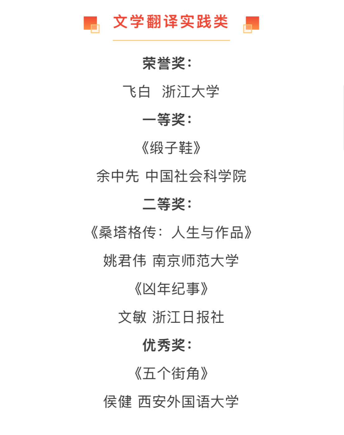 西班牙语专业侯健副教授凭借译著《五个街角》获翻译实践类优秀奖。